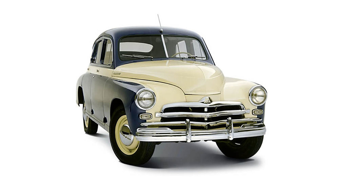 Surgido en 1946, el Pobeda ('Victoria') se convirtió en símbolo de la reconstrucción posbélica. Sus rasgos distintivos incluían una carrocería totalmente metálica de diseño pontón (sin partes salientes), una innovación revolucionaria en la URSS. Equipado con un motor de 2,1 litros (aproximadamente 50 CV) que permitía alcanzar los 105 km/h, una cifra notable para la época, el coche representaba un avance hacia el futuro, y su perfil se convirtió en un símbolo reconocible de la posguerra.